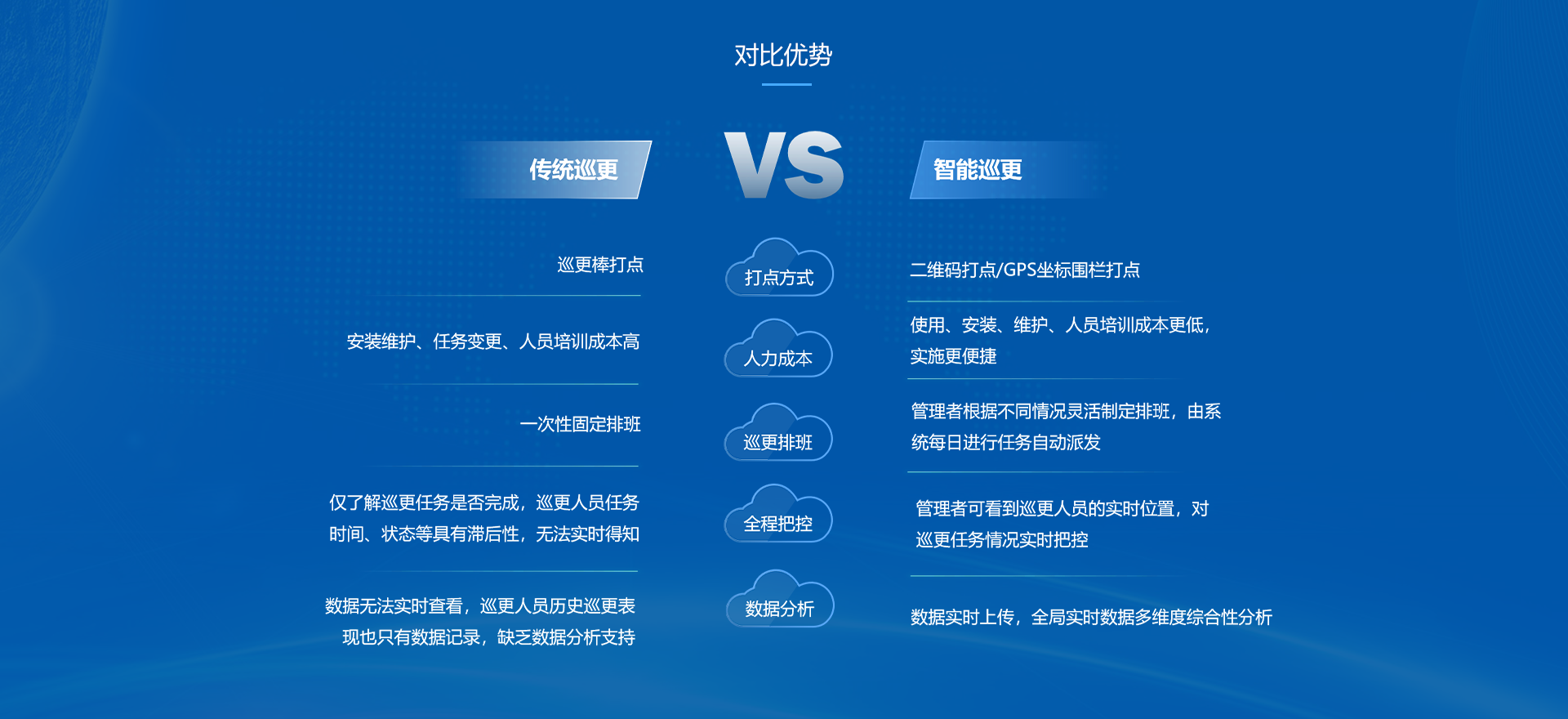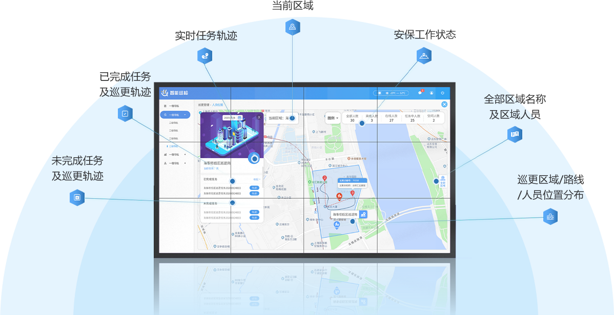 巡更管理系统依据地理信息技术,以手机作为巡更终端,提供PC端和移动端,随时随地了解安保人员巡更工作表现。系统的主要功能涵盖巡更区域、点位、计划的基本设置;巡更明细和巡更报表的导出;巡更数据总览和区域数据概览。通过智能巡更管理系统和巡管通APP为区域安全管理“赋能”,有效地实现了安保巡更人员表现的全方位可视化管理,提升区域精细化管理水平。