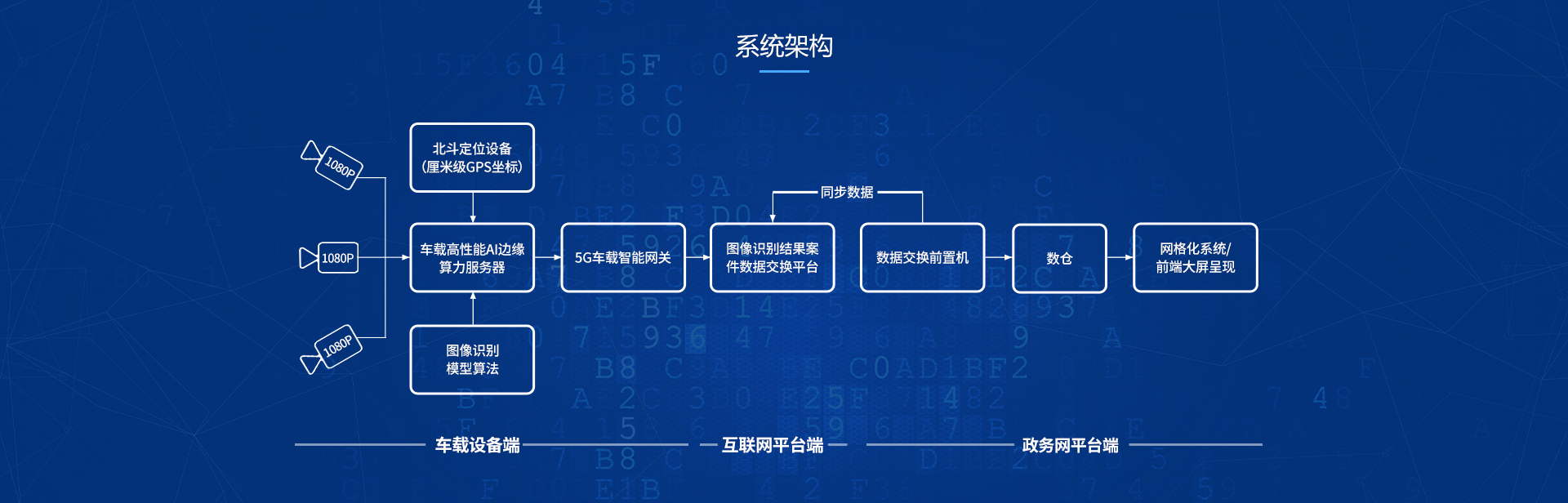 首先是通过车载多路高精度的前端摄像机和厘米级北斗定位设备来获取车辆移动巡查过程中街面实时视频图像数据和GPS坐标数据;其次是通过车载式