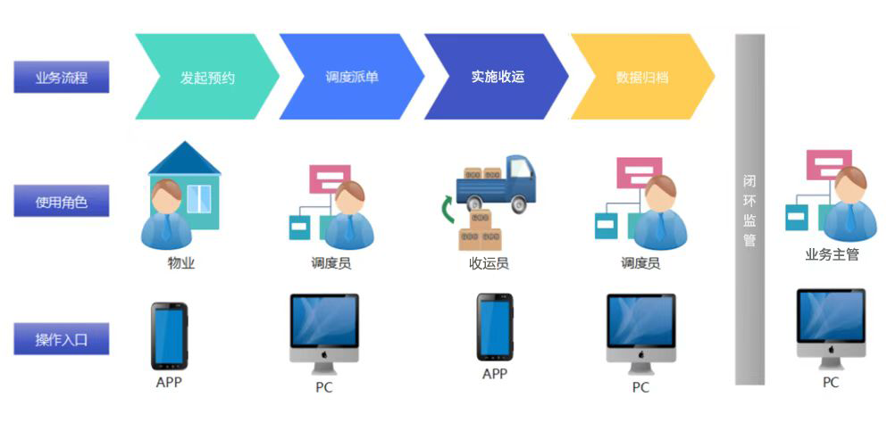 该方案对装修垃圾采取预约收运模式,形成从 预约收运-派单调度-收运反馈-归档结案-全程监管 的业务流程线上闭环,同时将行业主管的考核要求无缝内嵌在系统中,有效解决社区装修垃圾收运不及时、收运作业不精细、行业及公司监管成本高等难题。 同时利用前端订单聚合,实现划片集约收运,还可以 助力收运公司降本增效,提升社区收运时效 ,此外系统针对常见的车辆异常和预约变更,可以智能实现派单变更, 无需人工干预 。